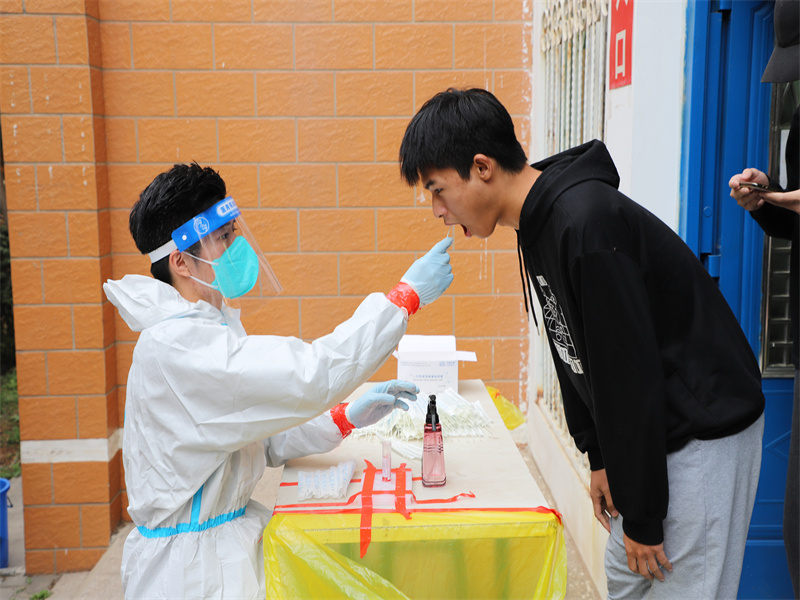 在核酸检测地、餐厅、超市、澡堂及教学楼、宿舍楼等地方,随处可见志愿者们忙碌的身影,他们身穿红马甲深入开展志愿服务,助力疫情防控。在核酸检测地,早上七点,志愿者们就已经到位开始准备工作,摆帐篷,布置场地,帮助医护人员做好核酸检测前的准备,在核酸检测开始后,引导学生主动配合,维持核酸检测现场秩序,帮助提高核酸检测效率。在餐厅、超市门口,志愿者在做好自身防控的同时,提醒同学们正确佩戴口罩,劝说同学们不要聚集逗留,保持距离,时刻秉持扫码可进的原则,同时,在人流量过多时志愿者也会组织同学们排队并控制好距离,按次序进入。在教学楼、澡堂等公共场合进出门口,志愿者会贴心提醒每一位进出的同学时刻戴好口罩,做好疫情防控措施,扫码进出。在宿舍楼进出门口,也会看到志愿者劝导同学们扫场所码、查看扫码信息,然后让同学们进出的场景,整个过程细致认真。同时,本次志愿活动每日分时段轮流,定点换班,在餐厅、超市、澡堂及教学楼、宿舍楼等地方的出入口处执勤,大家各司其职、分工明确,一起保障校园内的疫情防控安全,用责任和担当筑牢疫情防控阻击线,凝聚力量战胜疫情。